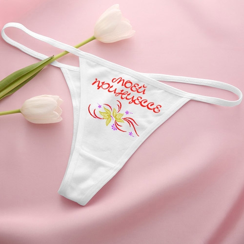 Интимные подарки, конечно, не для всех. Их дарят самым любимым в соответствующей обстановке, вдали от посторонних глаз. Но именно такие подарки вызывают ту самую волну трепетных чувств, которая подхватывает двух любящих людей и уносит в мир счастливых грез. Хотите испытать подобные чувства? Тогда подарите своей любимой девушке очаровательные трусики с красивой вышивкой вашего нежного пожелания или признания. Вы можете придумать его сами или воспользоваться подсказкой наших консультантов. Подарите любимой нежность, и она ответит вам взаимностью во сто крат.