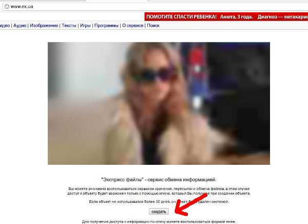 На главной странице сайта www.ex.ua необходимо нажать на кнопку «создать». На прилагаемом снимке необходимая кнопка указана красной стрелочкой.