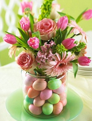 Для декора можно добавить разукрашенные пасхальные яйца, которые нужно выложить на дно прозрачной вазы, а между яиц спрятать гидрогель (заменитель воды для цветов). Будет впечатление, что у вас ваза со свежими цветами стоит прямо в яйцах.