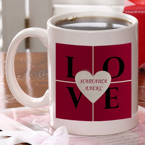 Открывают наш список, конечно же, кружки, но кружки не простые, а с фотопечатью. Популярность такой посуды объясняется достаточно просто: во-первых, кружка весьма необходимый предмет в быту, во-вторых, если нанести на ее изображение влюбленной пары, то она преображается до неузнаваемости.